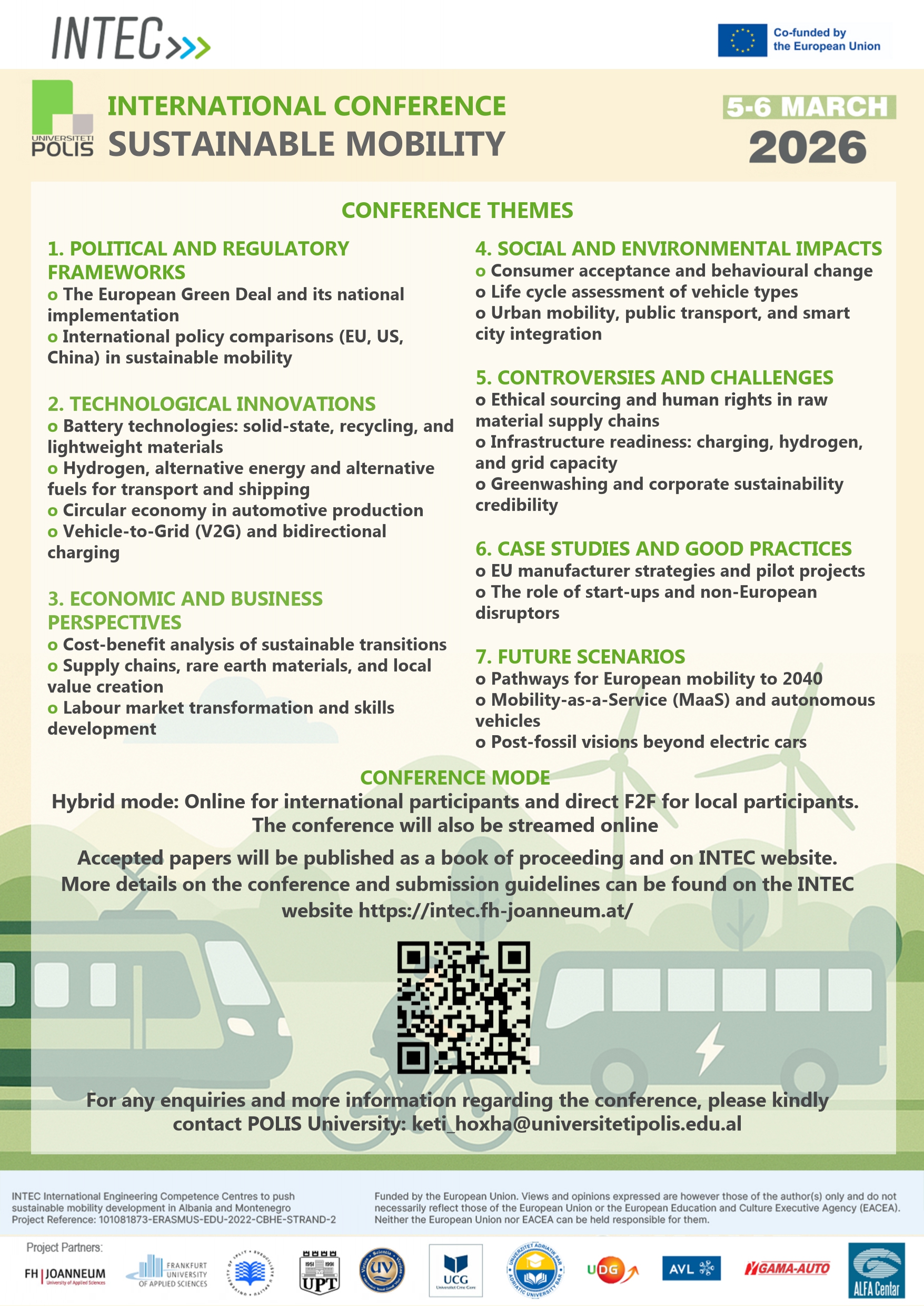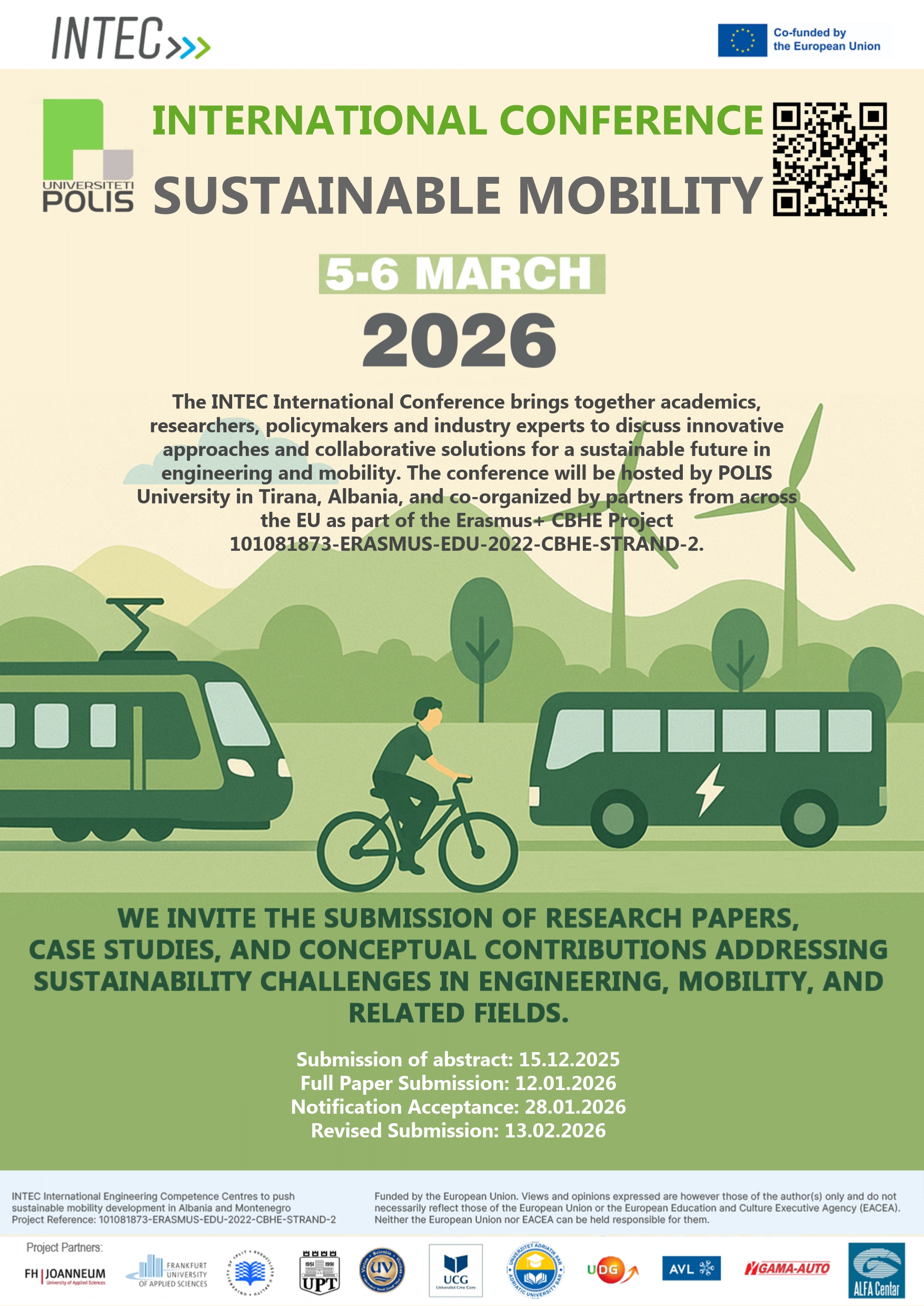 Konferencija će biti održana 5–6. marta 2026. godine na Univerzitetu POLIS u Tirani (Albanija) i okupiće partnere iz brojnih evropskih visokoškolskih i istraživačkih institucija, kao i predstavnike privrede i donosioce odluka iz oblasti održive mobilnosti i inženjerstva.